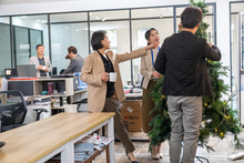 图片标题: 六个人的亚洲摄影团队在摄影棚里,做拍摄前的准备工作。