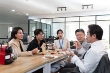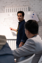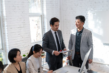 图片标题: 两位亚洲中年男艺术家,在一幅油画前讨论创作思路。