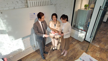 图片标题: 会议室里,三位东方商务人士交流工作