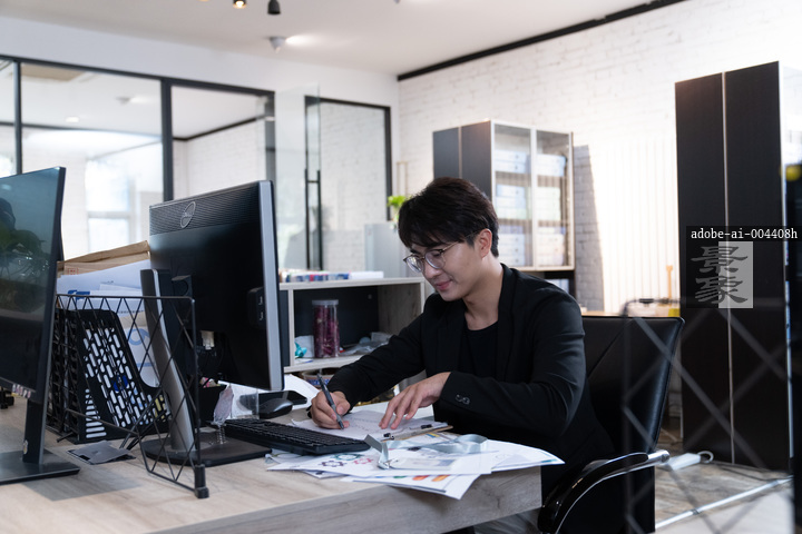 图片标题: 办公室里,一位东方商务男士坐在电脑前快乐的工作