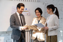 图片标题: 三位亚洲商务人士在办公室里争吵,大家对工作的意见不能统一。