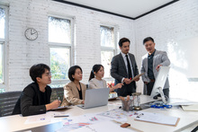 图片标题: 在办公室里,东方商务团队在开会讨论工作方案。