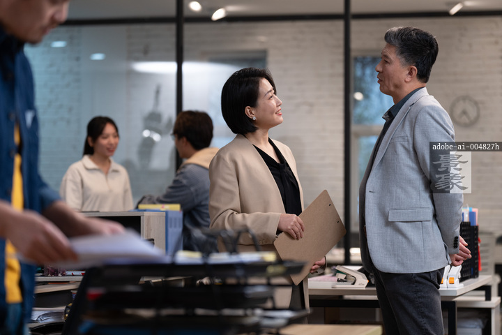 图片标题: 五位东方商务人士在办公室里,认真的沟通讨论工作方案。