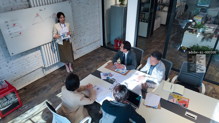 图片标题:     五个东方商务人士在会议室里开会,一位女职员在白板前演讲工作