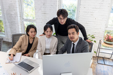 图片标题: 三位亚洲商务人士坐在会议室里开会交流工作