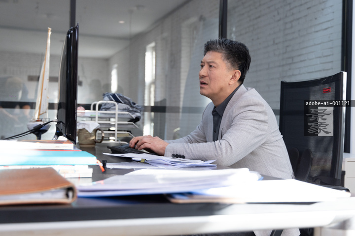 图片标题: 办公室里,一个东方商务男士坐在电脑前工作