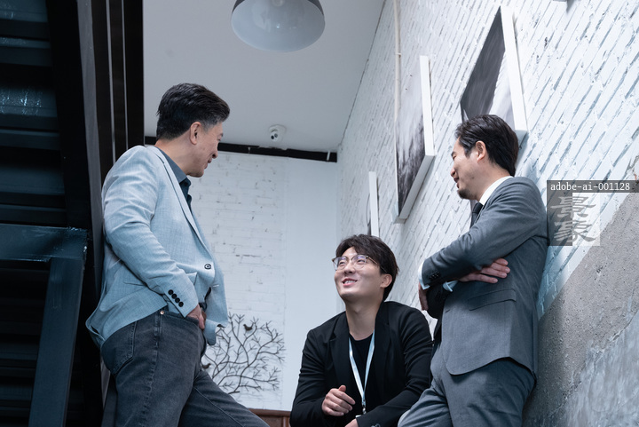图片标题: 办公室的楼梯上,三位商务男士聊天交流