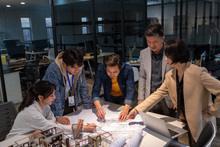 图片标题: 两位亚洲中年男艺术家,在一幅油画前讨论创作思路。