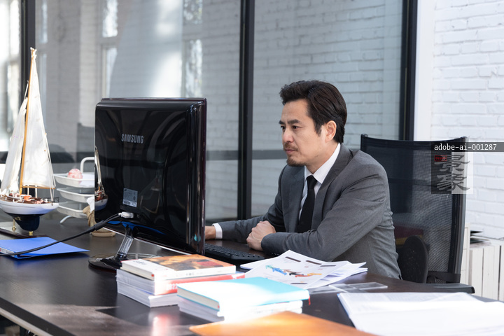 图片标题: 办公室里,一位亚洲商务男士坐在电脑前工作