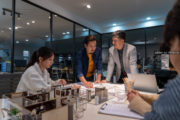 图片标题: 五位东方建筑设计师在办公室里,深夜加班讨论设计图纸和房屋模型的修改方案。