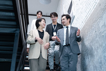 图片标题: 办公室的楼梯上,三位商务男士聊天交流