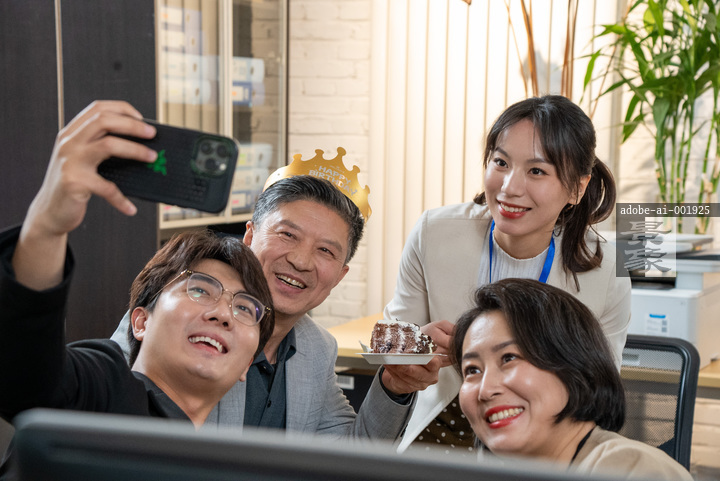 图片标题: 四位亚洲商务人士在办公室里给一名同事庆祝生日,用手机拍照