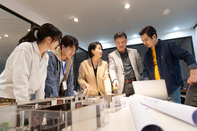 图片标题: 两位亚洲建筑设计师在会议室里开会,桌上有设计图纸和房屋模型