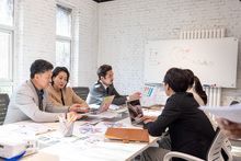 图片标题: 三位商务人士在办公室里开会,两位商务男士指着电脑上的数据讲解