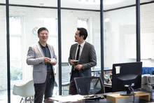 图片标题: 五位亚洲商务人士在办公室里给其中一名女职员庆祝生日,生日蛋糕上插着蜡烛