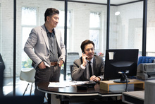 图片标题: 两位亚洲商务人士坐在会议室里表情郁闷情绪低落