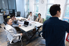 图片标题: 五个东方人坐在会议室,商务男士介绍新同事