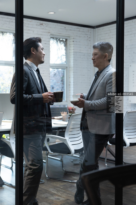 图片标题: 办公室的休息时间,两位亚洲商务男士站着喝咖啡聊天