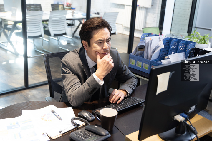 图片标题: 办公室里,一位亚洲商务男士坐在电脑前工作,表情严肃认真