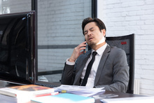 图片标题: 办公室的休息时间,两位亚洲商务男士站着喝咖啡聊天