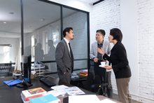 图片标题: 办公室里,两位亚洲商务男士坐在电脑前讨论工作,手机拿着文件