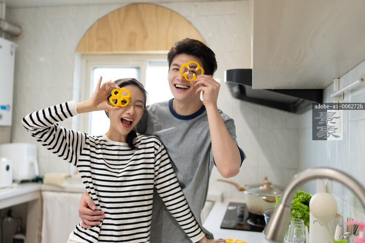 图片标题: 一对年轻的亚洲情侣在宽敞明亮的厨房里,一边切菜一边拿着彩椒嬉戏打闹。