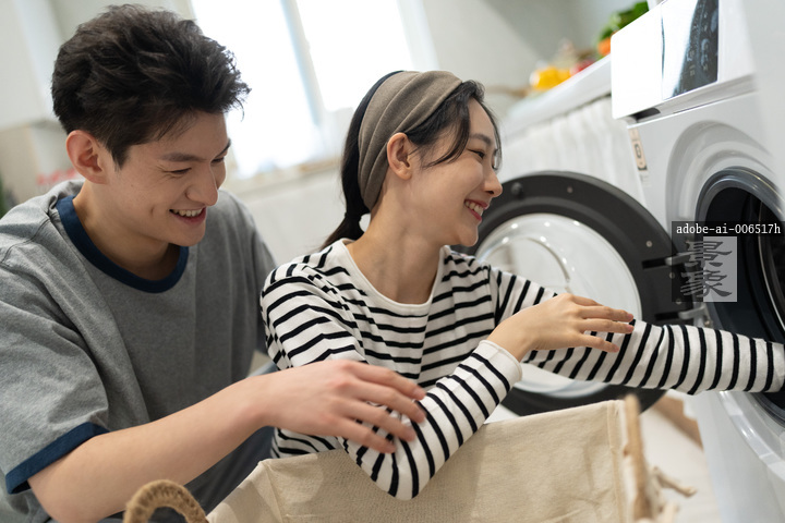 图片标题: 一对年轻的亚洲情侣在厨房里,一起做家务,准备洗衣服。