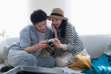 图片标题: 情人节,一对年轻的亚洲情侣坐在客厅的沙发上,高兴激动的拆礼物。