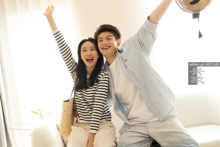 图片标题: 一对年轻的亚洲情侣在客厅里,收拾好行李,兴奋的坐在皮箱上准备出去旅游。