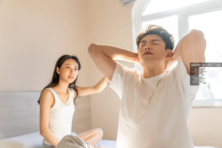 图片标题: 一对亚洲青年情侣吵架,生气的坐在床上