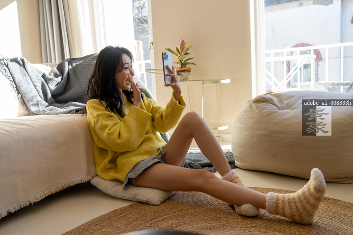 图片标题: 一位亚洲青年女人在客厅,坐在地板上倚靠着沙发看手机