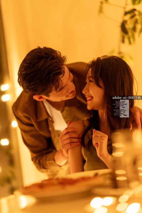 图片标题: 一对亚洲情侣享用烛光晚餐,青年男人给女朋友戴订婚戒指