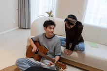 图片标题: 一对年轻的亚洲情侣在客厅里,收拾行李箱准备出去旅游。