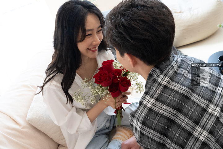 图片标题: 一对亚洲青年情侣在客厅,高兴的拿着玫瑰花