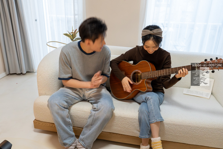 图片标题: 一对年轻的亚洲情侣坐在客厅的沙发上弹吉他