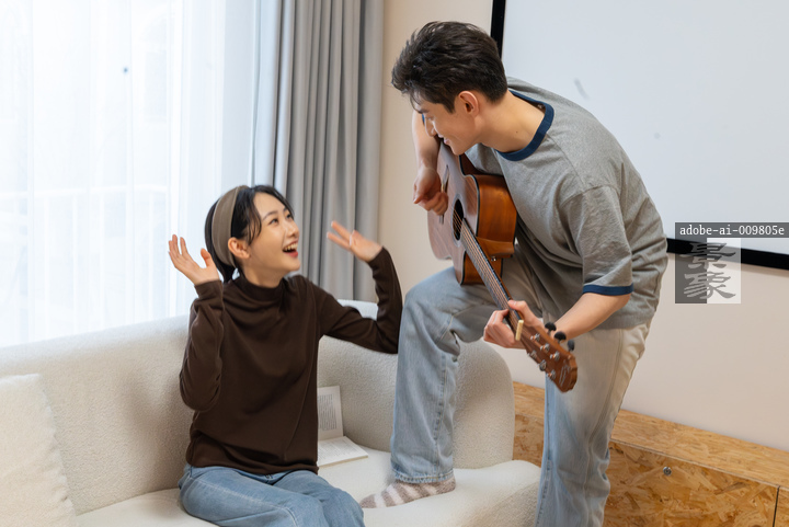 图片标题: 一对年轻的亚洲情侣坐在客厅的沙发上弹吉他