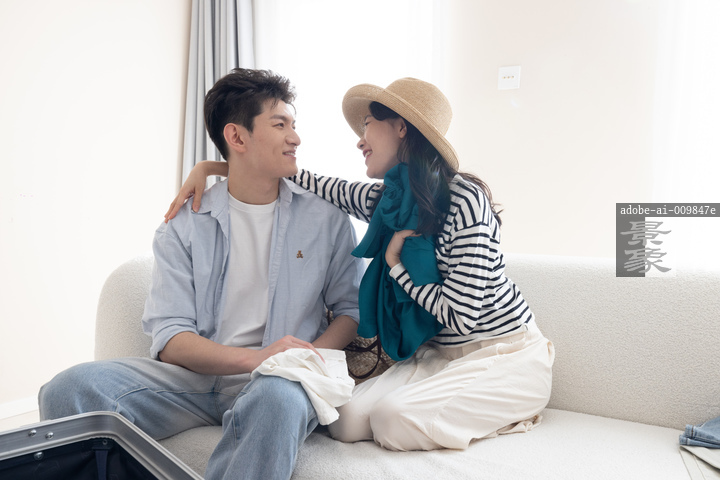 图片标题: 一对年轻的亚洲情侣在客厅里,试穿衣服,收拾行李箱准备出去旅游。