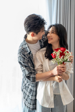 图片标题: 一对亚洲青年情侣在客厅,高兴的拆礼物