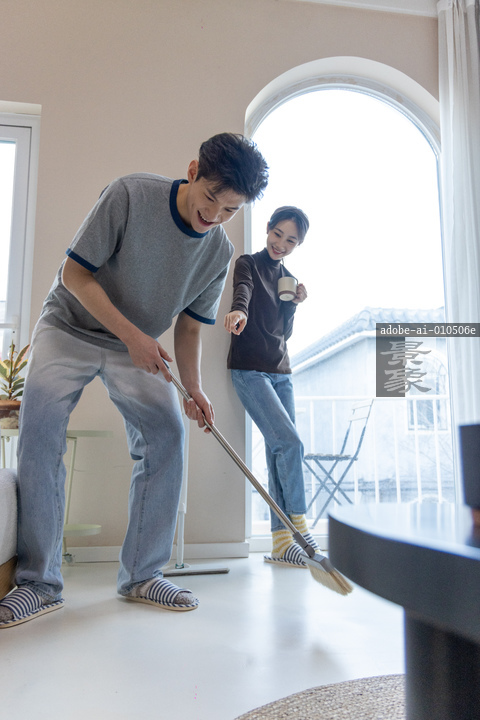 图片标题: 一对年轻的亚洲情侣在宽敞明亮的客厅里,男士打扫卫生女士在旁边喝水闲聊。