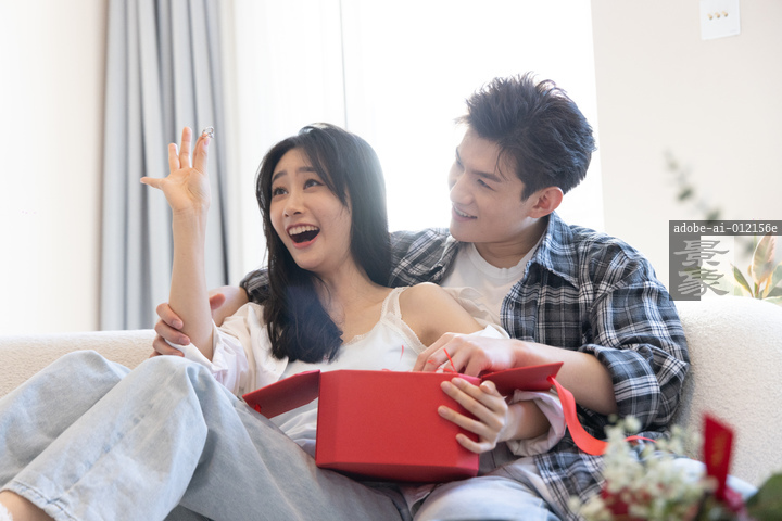 图片标题: 一对亚洲青年情侣在客厅,青年女人收到男朋友送的戒指