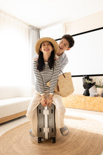图片标题: 一对年轻的亚洲情侣在客厅里,试穿衣服,收拾行李箱准备出去旅游。