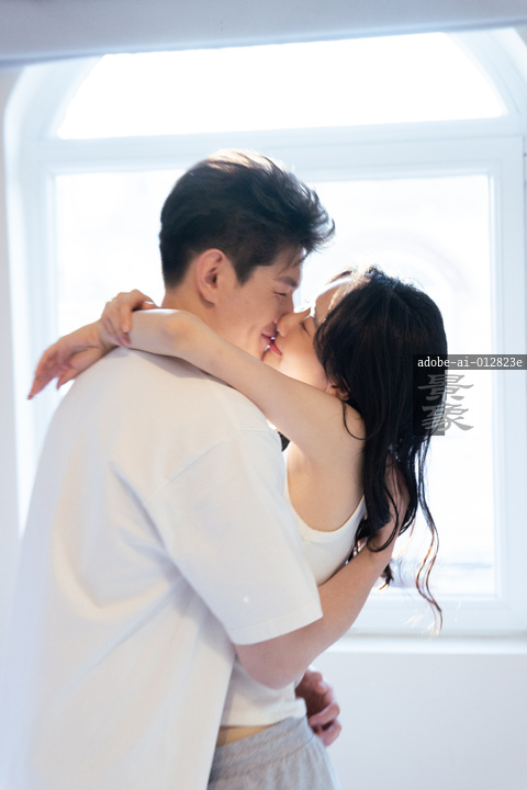 图片标题: 一对年轻的亚洲情侣在卧室深情的相拥在一起,卧室充满阳光。