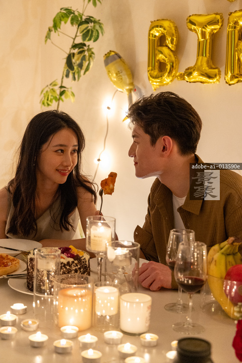 图片标题:     一对年轻的亚洲情侣在精心布置的家庭环境中,浪漫的庆祝生日,吃披萨吃生日蛋糕意大利面。