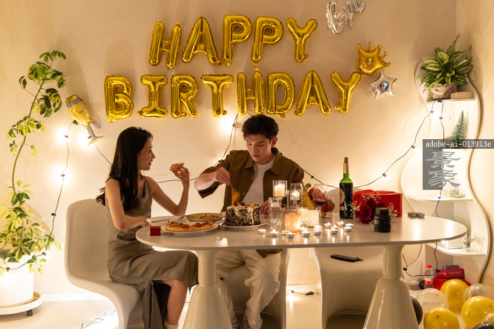 图片标题: 一对年轻的亚洲情侣在精心布置的家庭环境中,浪漫的庆祝生日,吃披萨吃生日蛋糕意大利面。