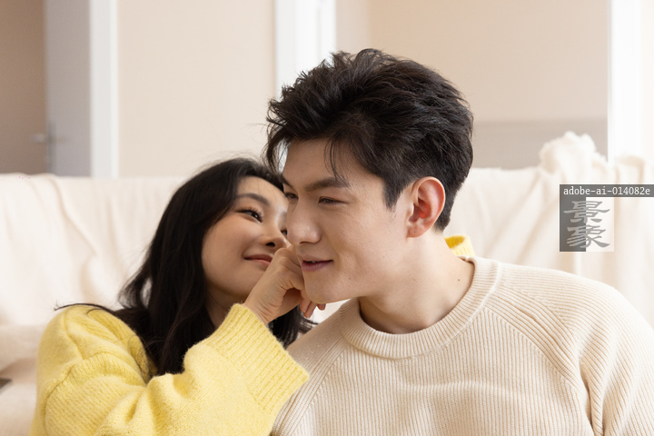图片标题:     一对年轻的亚洲情侣在客厅,坐在沙发上拥抱着聊天。
