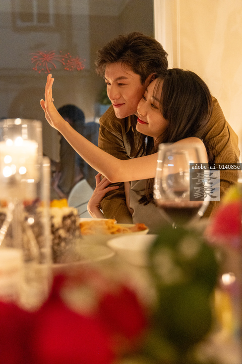 图片标题: 一对年轻的亚洲情侣在精心布置的家庭环境中,女孩收到男朋友的神秘礼物求婚钻戒。