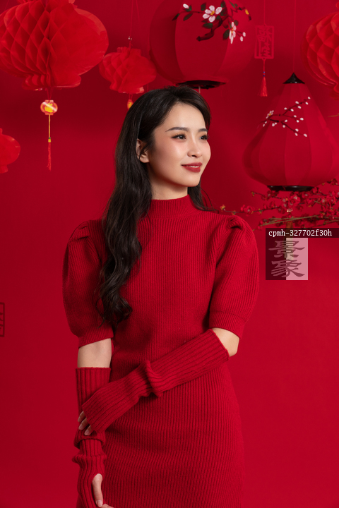 图片标题: 新年气氛,红色背景下的一位亚洲青年女性过新年