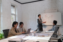图片标题: 会议室里,三位亚洲商务人士交流工作