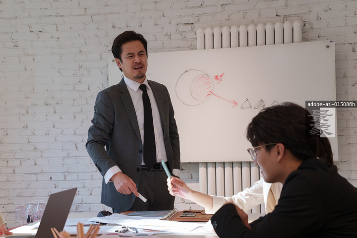 图片标题: 四位亚洲商务人士在会议室里开会,一位商务男士在白板前演讲工作
