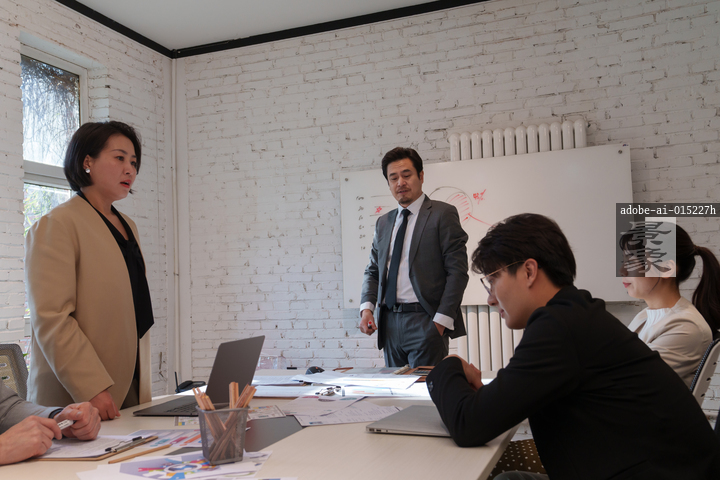 图片标题: 五个东方商务人士在会议室里开会,桌上有文件和电脑。